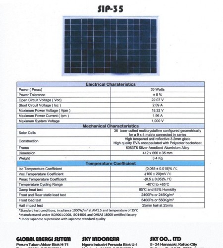 Modul Solar Panel 35 Wp Polycrystalline bergaransi hingga 20 Tahun dan sudah memiliki sertifikasi BBPT, TKDN, Laporan Test Uji, IUI, SNI ISO 9001 : 2008, ISO 14001 : 2004, OHSAS 18001 : 2007