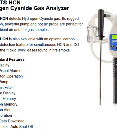 SENSIT® HCN is also available with an optional carbon monoxide detection feature for simultaneous HCN and CO testing for the "Toxic Twin" gases found in fire smoke.