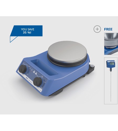 Newly designed, economic magnetic stirrer with heating. Bushing according to DIN 12878 for connecting an electronic contact thermometer, such as the ETS-D5. Highly accurate temperature control is possible with sensor placed directly in the medium. High heat output of 600 watts and stainless steel compound hot plate ensures rapid heating. Adjustable safety temperature from 100 to 360 °C.