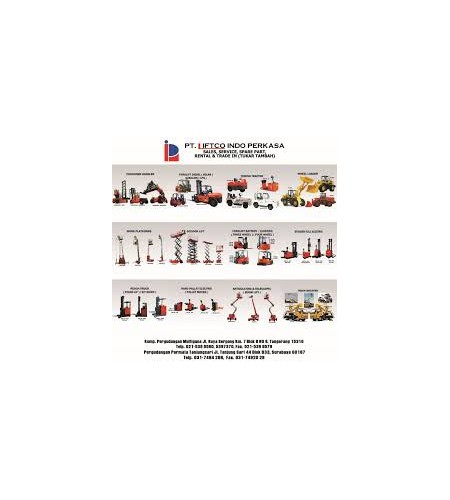 PT.Liftco Indo Perkasa adalah perusahaan yang bergerak di bidang material handling dan maintenance building equipment Yang berlokasi di Jakarta & Surabaya dan Kami Melayani Kebutuhan di Seluruh Indonesia, melayani sales, service, spare parts, trade in, dan rental alat – alat angkat untuk kebutuhan industri, proyek – proyek (kontraktor) akan alat bantu kerja diketinggian, seperti Forkliftdiesel, forklift batteray, forklift LPG, forklift Gasoline, hand pallet electrik, stracker elektrik, handlift elektrik, Reachtruck, Container Handler, Towing Tracktor, Pallet Mover, Wheel Loader, Workplatform, Scissorlift, boom lift, ReachStacker, tangga elektrik, manlift, tangga gunting elektrik, alumunium work platform, dan masih banyak lagi.