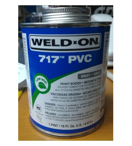 WELD-ON 717 CLEAR/GRAY: Heavy bodied,medium setting,low VOC PVC cement for all classes and schedules with interference fit through 12" (315 mm) diameter (non-pressure applications only up to 18"). Quality formulation for plumbing, industrial, pool, irrigation and electrical piping systems. It has good gap filling properties and its medium set allows more working time in warm weather.