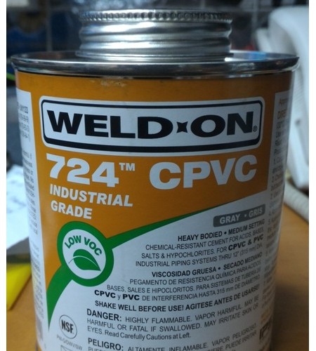 Weld-On 724 INDUSTRIAL GRADE ORANGE/GRAY: Heavy bodied, medium setting, low VOC CPVC cement for all classes and schedules with interference fit through 12" (315 mm) diameter. Premium,high-strength,chemical-resistant solvent cement for use with CPVC piping systems carrying acids, bases, salts, and hypochlorites. Ideal for use in waste water plants. May be used on PVC industrial piping systems for chemical applications. Approved for Corzan CPVC piping systems.