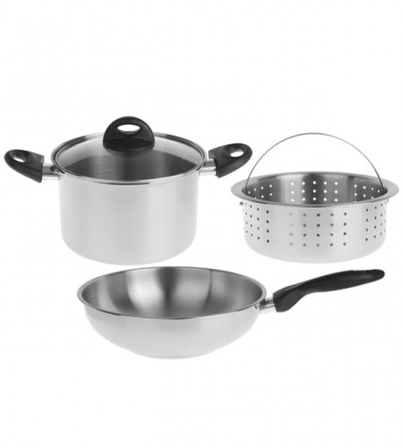 Cookware Set Of 4 adalah set peralatan memasak yang terdiri dari Wajan dan Panci sekaligus Steamer sehingga panci memiliki dua fungsi untuk merebus dan mengukus, dan disertai penutup dari kaca yang transparant sehingga mudah melihat masakan. Terbuat dari Stainless Steel yang Anti karat. Kelebihan menggunakan stainless steel adalah memasak akan cepat lebih cepat matang. Dilengkapi Heat Resistant Handle sehingga pegangan / handle tidak panas saat dipegang. Terbuat dari Stainless Steel yang Anti karat. Kelebihan menggunakan stainless steel adalah memasak akan cepat lebih cepat matang. Dilengkapi Heat Resistant Handle sehingga pegangan / handle tidak panas saat dipegang. Terbuat dari Stainless Steel yang Anti karat. Kelebihan menggunakan stainless steel adalah memasak akan cepat lebih cepat matang. Dilengkapi Heat Resistant Handle sehingga pegangan / handle tidak panas saat dipegang. Memiliki diameter Wajan : 28 cm dengan daya tampung 3.6 ltr dan Panci : 20 cm dengan daya tampung 3 ltr. Tinggi panci 12cm dan tinggi wajan 8cm. Stainless Steel Grade: 430.