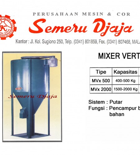 Mixer vertikal kami dibuat mulai kapasitas 500kg-2000kg. Bahan bisa dengan mild steel maupun stainless steel. Untuk info lebih lanjut hubungi 08170518645 (dewi) atau 0341 801859. Untuk produk kami yang lain dapat dilihat di www.semerujaya.blogspot.com