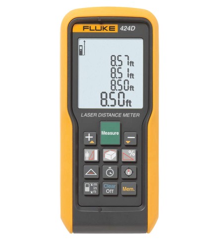 The Fluke 424D Laser Distance Meter - measures up to 100 m (330 feet). Includes tilt sensor for hard-to-reach measurements, corner angle feature and compass.