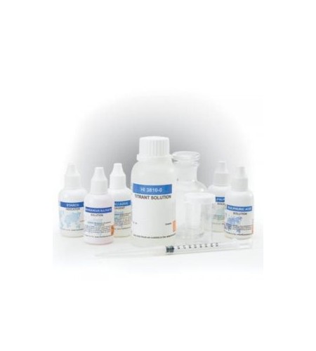 HI 3810 test kit dilengkapi dengan 30 mL larutan manganous sulfat, 30 mL alkali-azida reagen, 60 mL asam sulfat larutan (2), 10 indikator pati mL, 120 mL larutan titran, botol kaca dengan stopper, 10 mL kalibrasi vessel dan kalibrasi jarum suntik dengan tip