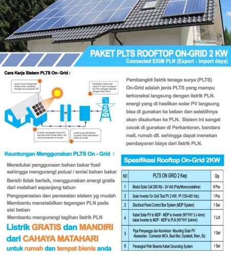 Pembangkit Listrik Tenaga Surya (PLTS) Rooftop On-Grid merupakan teknologi yang menggunakan sel photovoltaik (sel surya) untuk mengubah sinar matahari (surya) menjadi energi listrik. Pembangkit Listrik Tenaga Surya (PLTS) On-Grid adalah jenis PLTS yang mampu terkoneksi langsung dengan pembangkit listrik PLN, sehingga dapat terkoneksi dengan jaringan. energi listrik yang dihasilkan oleh panel surya dapat langsung di gunakan ke beban dan selebihnya akan disalurkan ke jaringan PLN.
