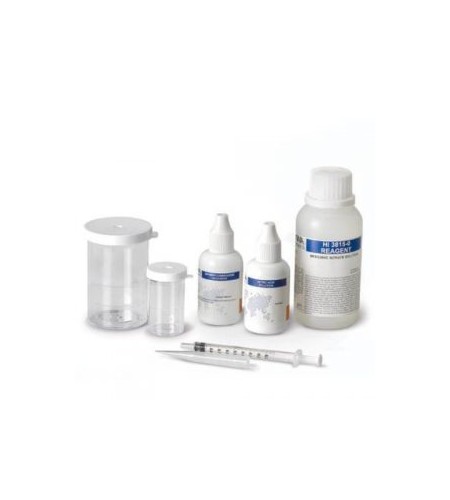 Hanna Chloride Test Kit HI 3815 dilengkapi dengan 15 mL indikator difenil-carbazone, 30 mL larutan asam nitrat, 120 mL nitrat merkuri solusi, gelas 50 mL yang sudah dikalibrasi, gelas 10 mL yang sudah dikalibrasi, alat titrasi jarum suntik.