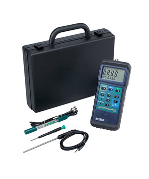 407228 is a Heavy Duty pH/ORP/Temperature meter which simultaneously displays pH or mV and Temperature on a large 1.4 inch LCD. It features 2 point Calibration and Slope adjustments, manual and auto temperature compensation, Min/Max/AVG, Auto power off, and Data Hold. A built-in RS-232 interface can be used with optional Data Acquisition Software and Datalogger. Comes complete with mini pH electrode, temperature probe, 9V battery, protective holster, and case.