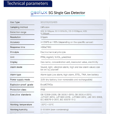 - Detection range : SO2: 0-100ppm, O2: 0-30%VOL, CO: 0-1000ppm, H2S: 0-100ppm