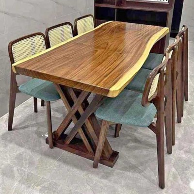 Set Meja Makan Trembesi Kaki X Kombinasi Kursi Rotan Jati