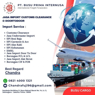 Kami dari PT. BUSU PRIMA INTERNUSA, Perusahaan International Freight Forwarders & importir Umum yang berdomisili di Jakarta dan kami siap membantu segala kebutuhan yang berhubungan dengan proses Kepabeanan, Customs Clearance import , Undername import, maka kami telah memiliki serta melengkapi beberapa izin yang diperlukan .