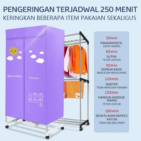- Pengering ini dilengkapi dengan daya bertenaga 1000W, yang dapat mengeringkan pakaian dengan cepat dan efektif. Pengering ini juga menggunakan metode pemanasan PTC untuk menghemat lebih banyak energi. - Kontrol sentuhnya sederhana dan intuitif, memungkinkan pengguna mengatur waktu dan mode pengeringan dengan mudah sesuai kebutuhan.