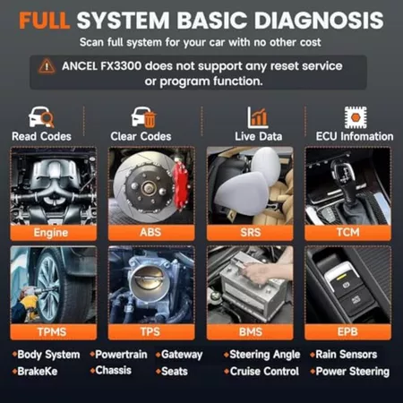 ✔[2024 OE-LEVEL Full System Scanning Tool]: The FX3300 obd2 scanner is an upgraded version of ANCEL with more powerful compatibility. It can quickly scan all systems and perform basic diagnostics such as engine, ABS, SAS, SRS, TPMS, TCM, fuel pump, EPS, suspension system, SCM, BMS, etc. You can easily access each failure system to view failure codes, real-time data, and more to help you identify and resolve vehicle issues in a timely manner. Note :ANCEL FX3300 does not support any reset services or program features