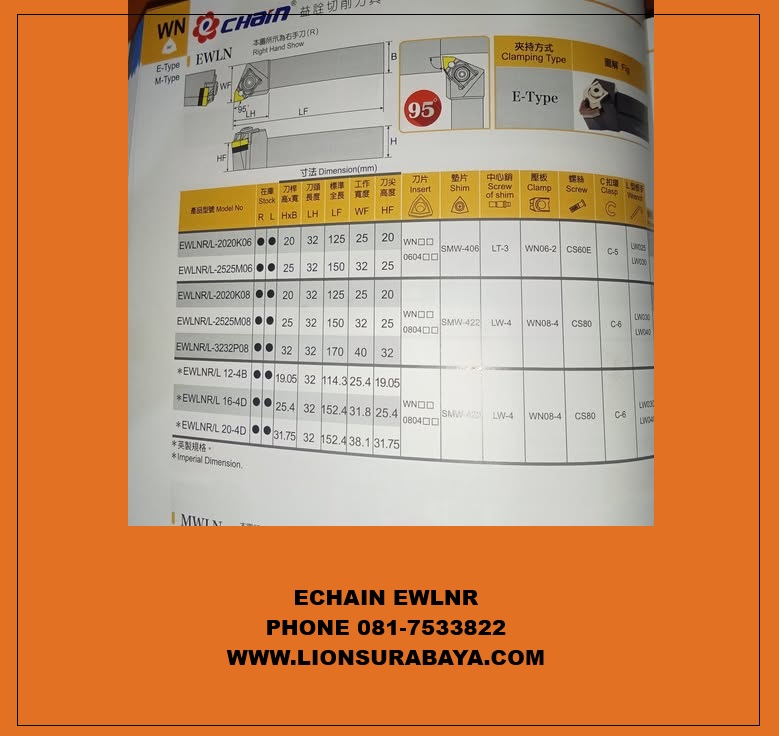 Spesifikasi Jual Holder Bubut Luar EWLNR ( WNMG080408 ) Merk Echain