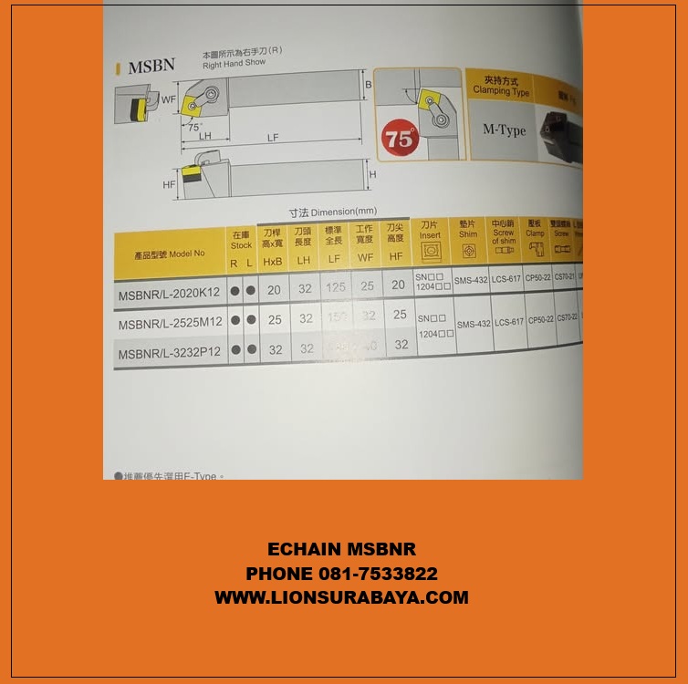 Spesifikasi Jual Holder Bubut Luar MSBNR ( SNMG1204 ) Merk Echain