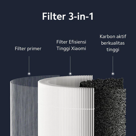 Xiaomi Air Purifier 4 Compact Filter dilengkapi dengan Filter 3-in-1. Kombinasi filter primer, Filter Efisiensi Tinggi Xiaomi, dan filter karbon aktif berkualitas tinggi akan memurnikan udara dan menjaga kesehatan kamu.