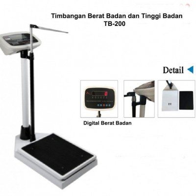 Timbangan Badan type TB-200 merupakan peralatan timbangan dua fungsi yaitu untuk mengukur berat badan secara digital dan pengukuran tinggi badan secara manual dengan menggunakan tiang mistar yang dilengkapi dengan deret angka dari 70cm hingga 200 cm. Timbangan Berat badan ini mudah di pergunakan karena pembacaan secara digital dengan hasil pengukuran tampak jelas dan terang. Pada bagian bawah yaitu injakan merupakan anti slip atau injakan anti licin