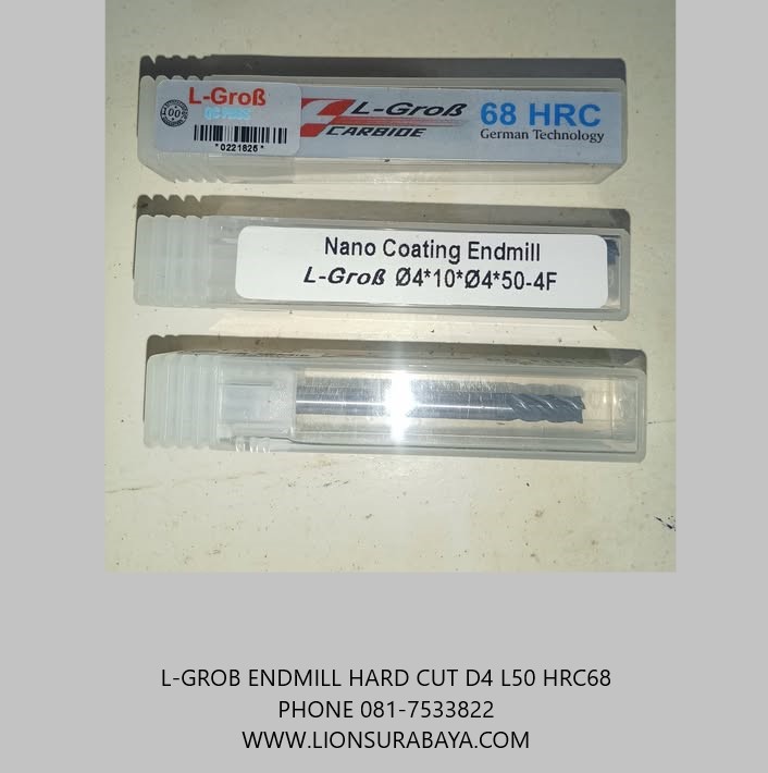 Endmill hard cut D4 L50 HRC68 merk L-grob tersedia di Indonesia melalui distributor resmi CV Lion Machine Solution ( cikarang, semarang, solo, jogja, Surabaya ), dan dirancang khusus untuk pemotongan material baja keras hingga 68 HRC.