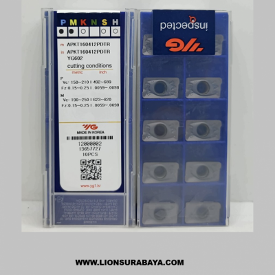 APKT160412PDTR YG602 adalah insert milling karbida (carbide) yang dirancang untuk performa tinggi pada mesin CNC, khususnya untuk aplikasi shoulder milling 90 derajat. Grade YG602 menggunakan substrat sub-mikron dengan lapisan PVD TiAlN yang menawarkan ketahanan panas dan kekuatan tepi yang optimal untuk pemesinan baja, baja tahan karat, dan besi cor.